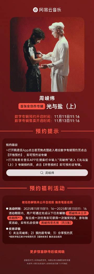 預告裡說11月13日11:16正式上線網易雲音樂,我立刻設定鬧鐘,連解鎖未公開自拍照的預約攻略都截了圖。結果今天點開APP,熟悉的灰色字樣又跳出來:「因版權限制,該內容在您所在的地區無法播放」——手機殼上貼的周峻緯小卡,突然變得有點燙手。